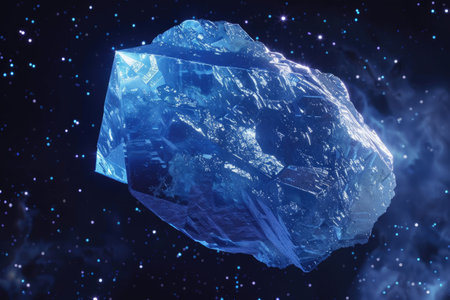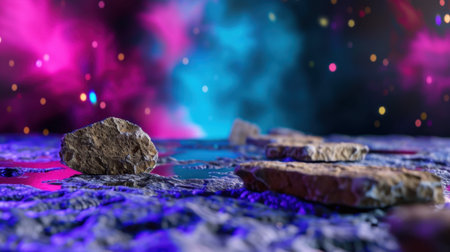 A glowing rock is situated on a flat surface with a mesmerizing star-filled galaxy in the background.