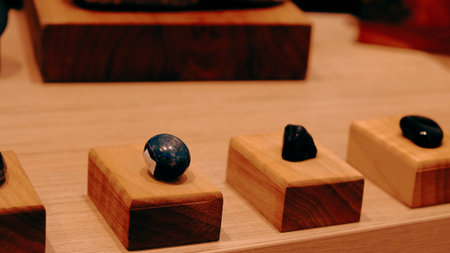 rare gems and minerals on a shelf in a souvenir shop and magic