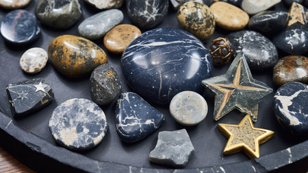 Crystals, tumbled natural stones on a carved dark blue table