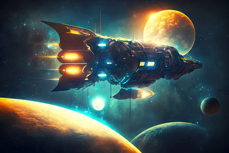 Futuristic spaceship propels through galaxy, powered by modern technology generated by artificial intelligence