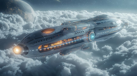 Spaceship orbiting Earth amidst clouds during futuristic journey in deep space exploration