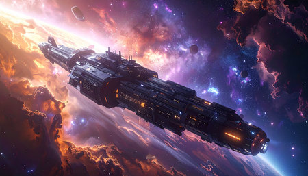 A futuristic spaceship soars through the cosmos.