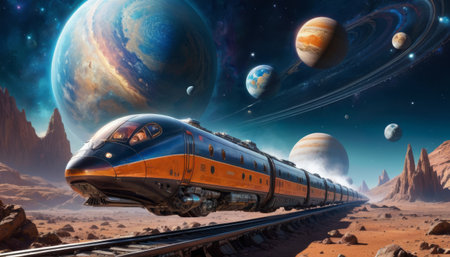 A fantastical illustration of a vintage train speeding across a desert landscape with an oversized, vivid planetscape in the sky above, blending science fiction with nostalgia.. AI Generation
