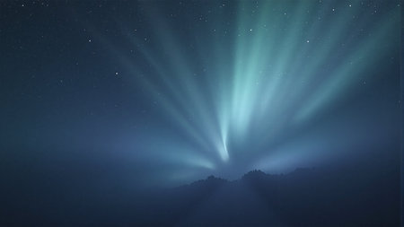 Bright light rays emanate from point dispersing into beautiful display across dark surroundings. Ethereal glow exudes sense of wonder and mystery, emphasizing beauty of light absence of visibility AI.