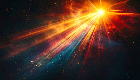 A sun flare with multicolored refractions, creating a vibrant and dynamic visual on a black canvas.