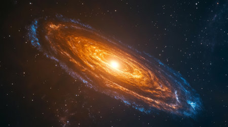 Glowing spiral galaxy with radiant starry core and swirling fiery orange and blue arms, cosmic vortex in deep space view. Astronomy and universe exploration concept