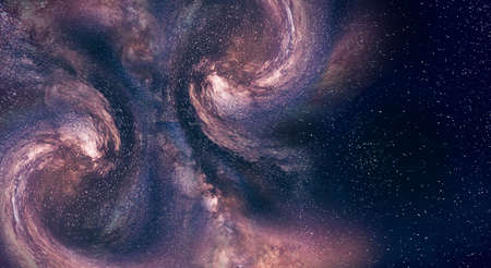 Planets in deep space. The collision of two red spiral galaxies. Science fiction.