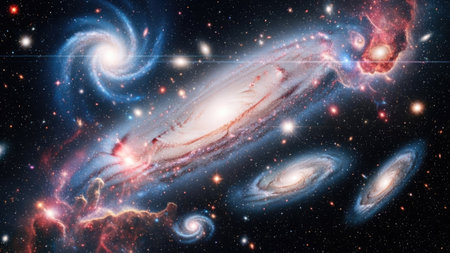 Cosmic ballet of celestial bodies amidst swirling galaxies and starlight backdrop