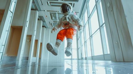 spaceman in a futuristic station. Man with space suit walking in an urban area