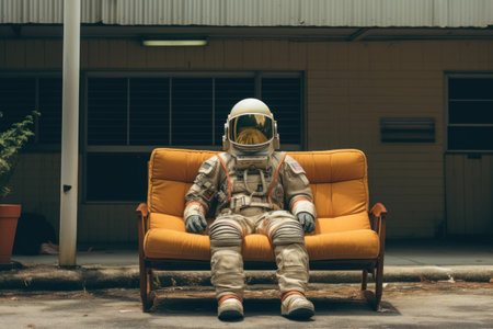 Astronaut in a spacesuit sitting under colorful lights