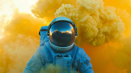 A man in a white space suit complete with helmet, gloves, and boots, is standing in front of billowing yellow smoke. The scene depicts an astronaut exploring a mysterious and hazardous environment.