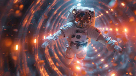 A brave astronaut in a spacesuit stands in front of a whirlwind of sparkles, creating a mysterious and exhilarating space experience