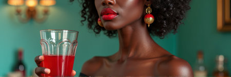 Elegant african female holding a glass of red beverage in stylish setting. That the image is generated using AI.