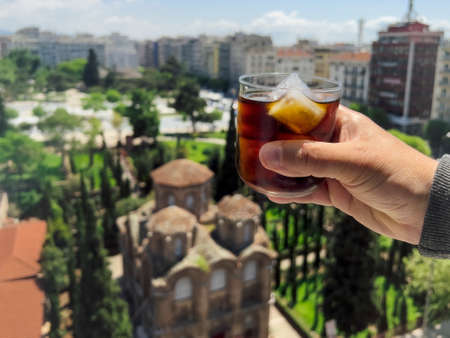 Day sunny view of human hand holding a glass of cold brew chilled coffee with ice cubes against a defocused urban background in Aristotelous square Thessaloniki, Greece.