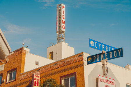 Pismo Beach, California, USA- March 2, 2023 Historic Pismo Beach hotel in downtown of the city, located one block from the Pismo Beach pier