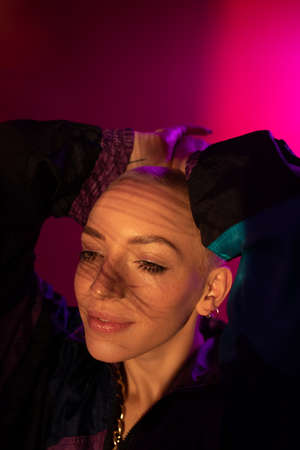 Portrait of glamorous woman under neon green light. Nightclub, trendy outfit. Teenager, zoomer Z-generation. Copy space