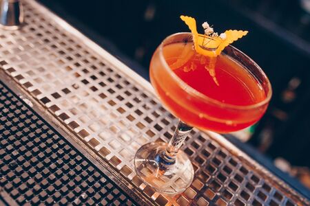 Sweet Famous white with caramels decoration slice Author inspired Cocktail Drink - on bar counter . Close-up Top view . Copy paste space for design people and luxury service barman in nightclub