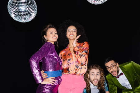 Stylish coupe in sunglasses dancing isolated on black with colorful lighting