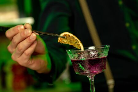 Close up of professional barman finishes preparation of alcoholic cocktail in multicolored neon light, gives it to client. Entertainment, drinks, service concept. Modern bar, trendy neoned colors.