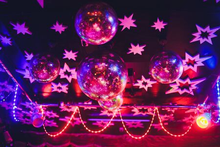 Beautiful shiny balls with colorful lights on ceiling in night club.