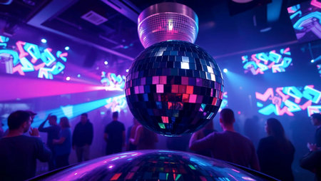 Night club scene with a single giant disco ball reflecting colorful laser beams in all directions, Ai generated image