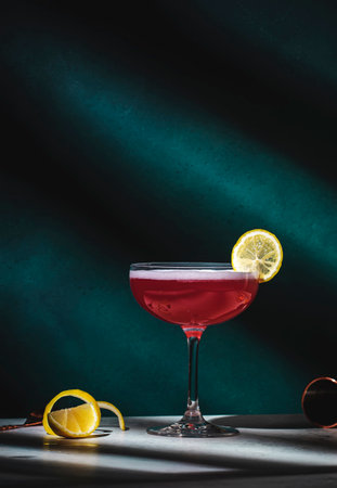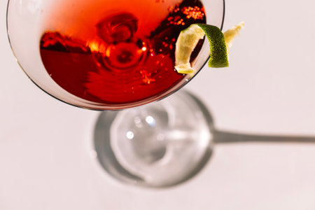 Close-up of a martini glass on a white table. An elegant goblet with a red alcoholic sparkling drink decorated with lime zest. Tasty berry cocktail on a minimalist background. Sunlight