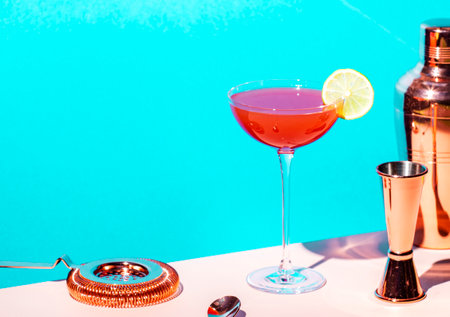 Classic alcoholic cocktail cosmopolitan with vodka, liqueur, cranberry juice, lime, ice and orange zest, gray bar counter background, bartender tols, space for text