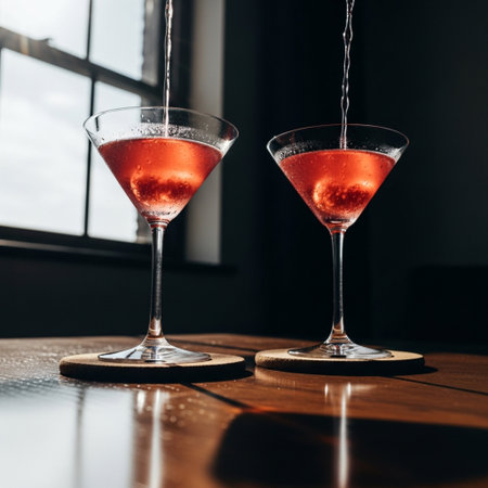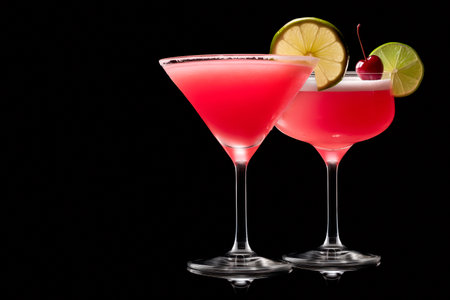 Cinematic low-angle shot of two fresh pink Cosmopolitan cocktails in martini glasses on coasters.