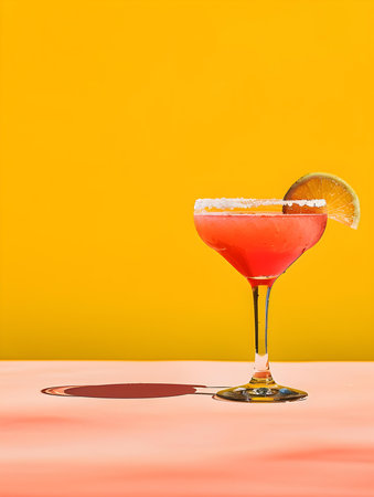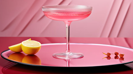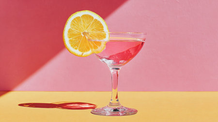 A refreshing pink cocktail, garnished with a lemon slice, is presented in a stem glass. The image features vibrant colors, with the cocktail set against a two-tone pink background and a yellow surface, highlighting its elegance. This image is suitable for various commercial uses, including advertising and editorial content.