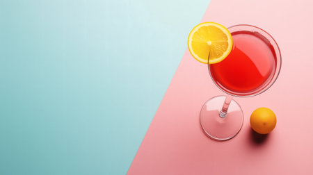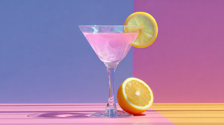A cosmopolitan cocktail is presented with a lemon slice garnish against a colorful backdrop. The image showcases a clear glass with a pink drink. The vibrant composition features contrasting orange, purple and pink hues, possibly suggesting a studio setting. This image could be used for lifestyle, culinary, or promotional purposes.
