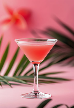 A delicate pink cocktail is elegantly presented in a tall glass, surrounded by lush green palm leaves and a soft pink backdrop, creating a vibrant and tropical atmosphere.