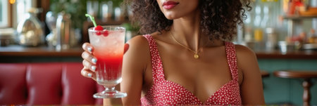 African female adult enjoying a refreshing cocktail at a cozy bar. That the image is generated using AI.