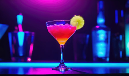 A Vibrant Cocktail Glowing Under Neon Lights at Night.
