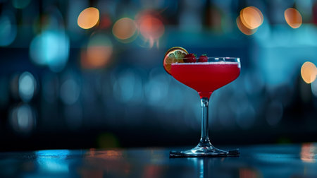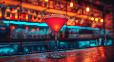 Glass of red alcoholic cocktail on bar counter in night club.AI Generative.
