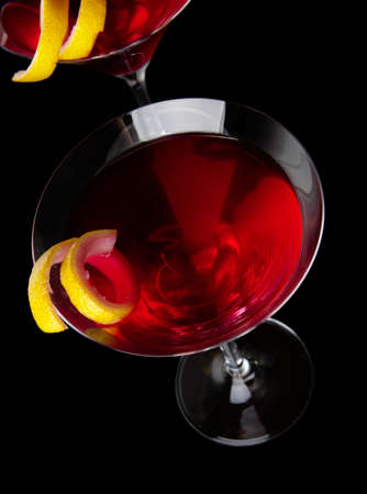 Two drinks of pink cosmopolitan from above isolated on black background