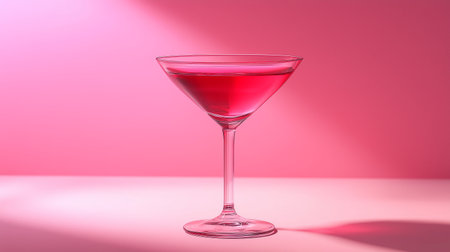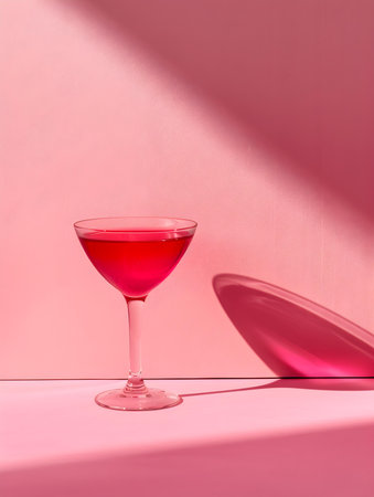 A vibrant pink cocktail in a martini glass stands elegantly against a soft pink background with artistic lighting