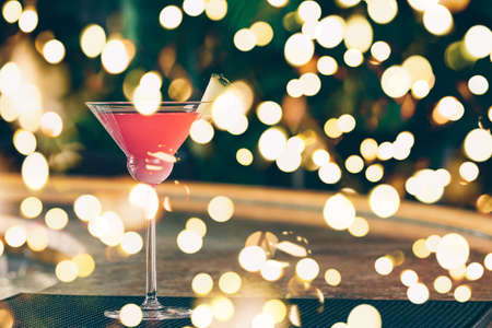 Cosmopolitan cocktail at the bar stand. Luxury vacation concept. Horizontal. Bold festive bokeh