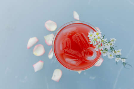 Cocktail bar background. Rose beverage with vodka, pineapple juice and strawberry champagne served with lemon slice and rose petals at pink backdrop, copy space