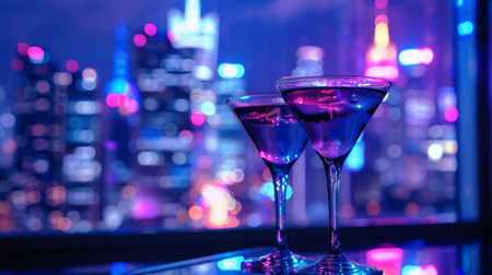 two colorful drinks in martini glass and big night city background, illuminated light skyline with skyscrapers, nightclub and party concept. High quality photo