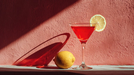 A vibrant cosmopolitan cocktail sits on a surface beside a whole lemon and its shadow. The drink is a bright red, contrasted against a textured pink background. The composition features strong overhead lighting, creating deep shadows. This image could be used for various commercial or editorial purposes.