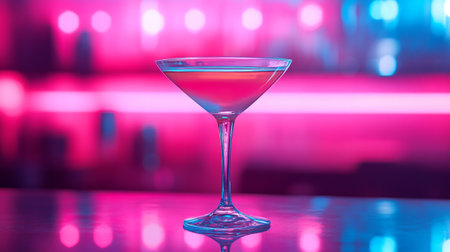 Martini glass on the bar counter with a pink and blue background