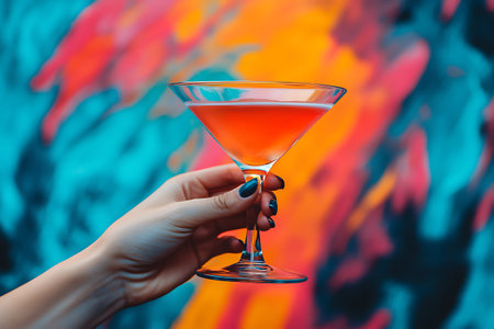Female hand holding a martini glass on colorful background. Close up.
