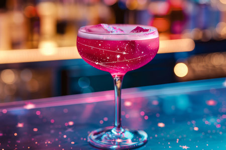 A pink celestial-themed drink with constellations sits on a table, A celestial-themed cocktail with constellations and cosmic patterns