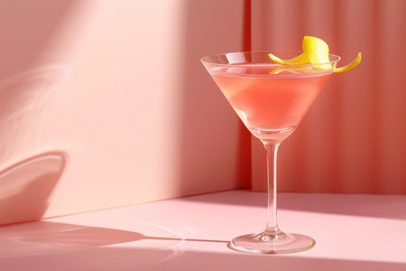 A classic Cosmopolitan cocktail is displayed with a lemon garnish. The pink drink sits in a stemmed glass against a softly lit pink background, suggesting a studio setting. The composition highlights the drink, suitable for advertising, culinary, or lifestyle content needs.