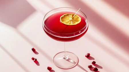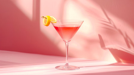 A vibrant pink cocktail is presented in a classic martini glass with a lemon slice accent. The drink is set against a solid pink backdrop, with soft shadows adding depth. The composition utilizes sunlight to highlight the refreshment. Suitable for advertising, beverage promotions, or lifestyle content.
