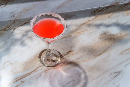 Pink martini with salted rim on marble kitchen table