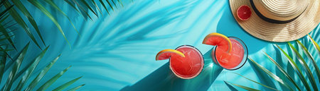 Summer background with tropical palm leaves, straw hat and cocktails. Top view with copy space