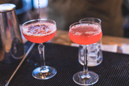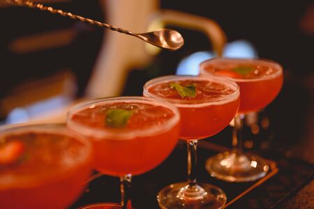 Close-up of expert bartender making red cocktail on the bar