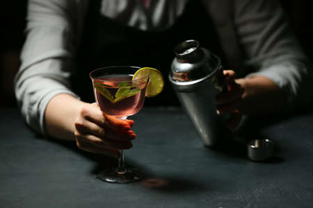 Female bartender making tasty cosmopolitan cocktail on dark background, closeup