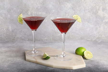 Board with glasses of Cosmopolitan cocktail and lime on gray background